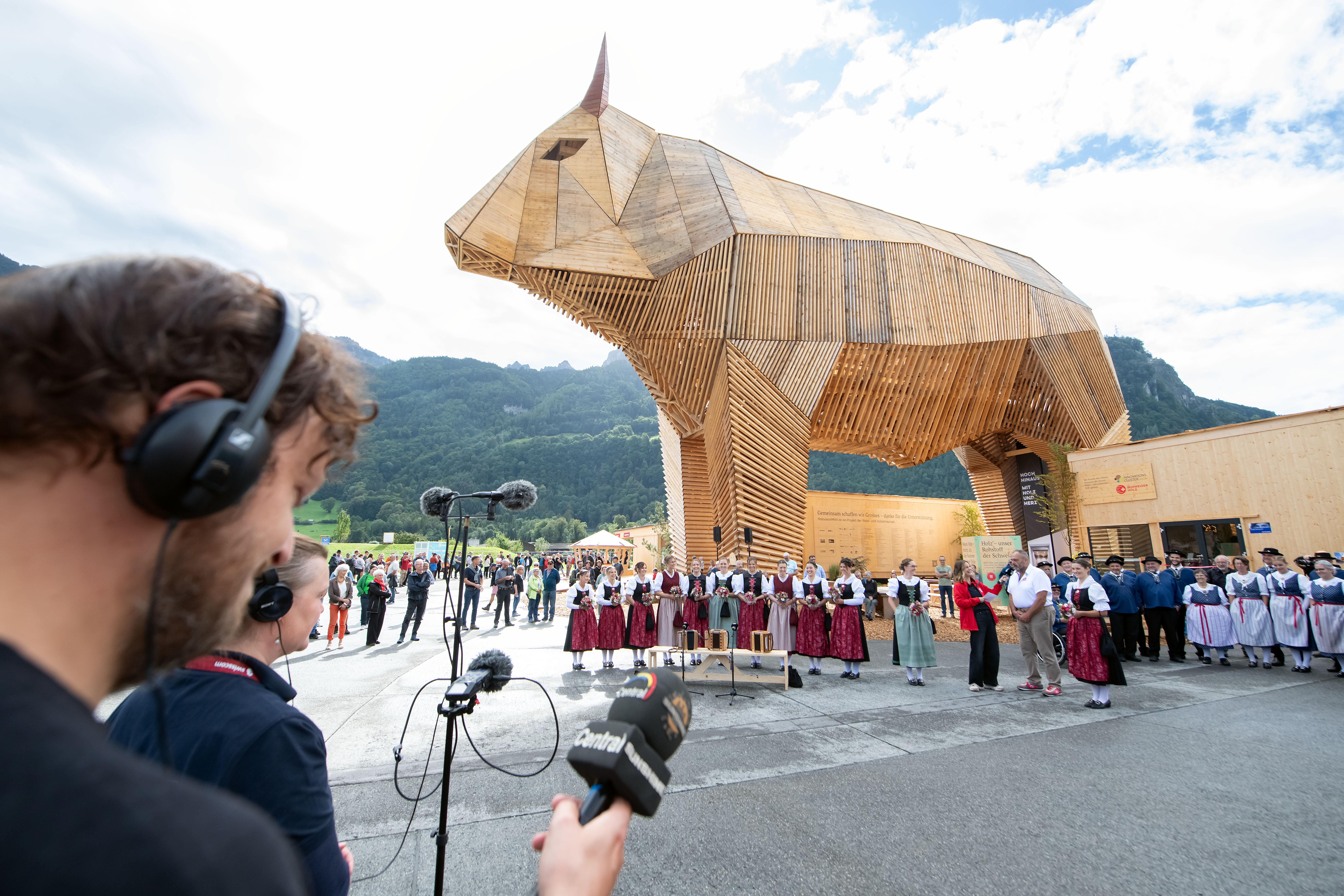 Das ESAF 2025 Glarnerland+ ist eröffnet. OK-Präsident Jakob Kamm sticht das Fass an und begrüsst offiziell zum Eidgenössischen Schwing- und Älplerfest 2025 – im Bild: Die Ehrendamen und Moderatorin Fabienne Gyr im Gespräch mit Hansruedi Hauser, Präsident des Trägervereins.