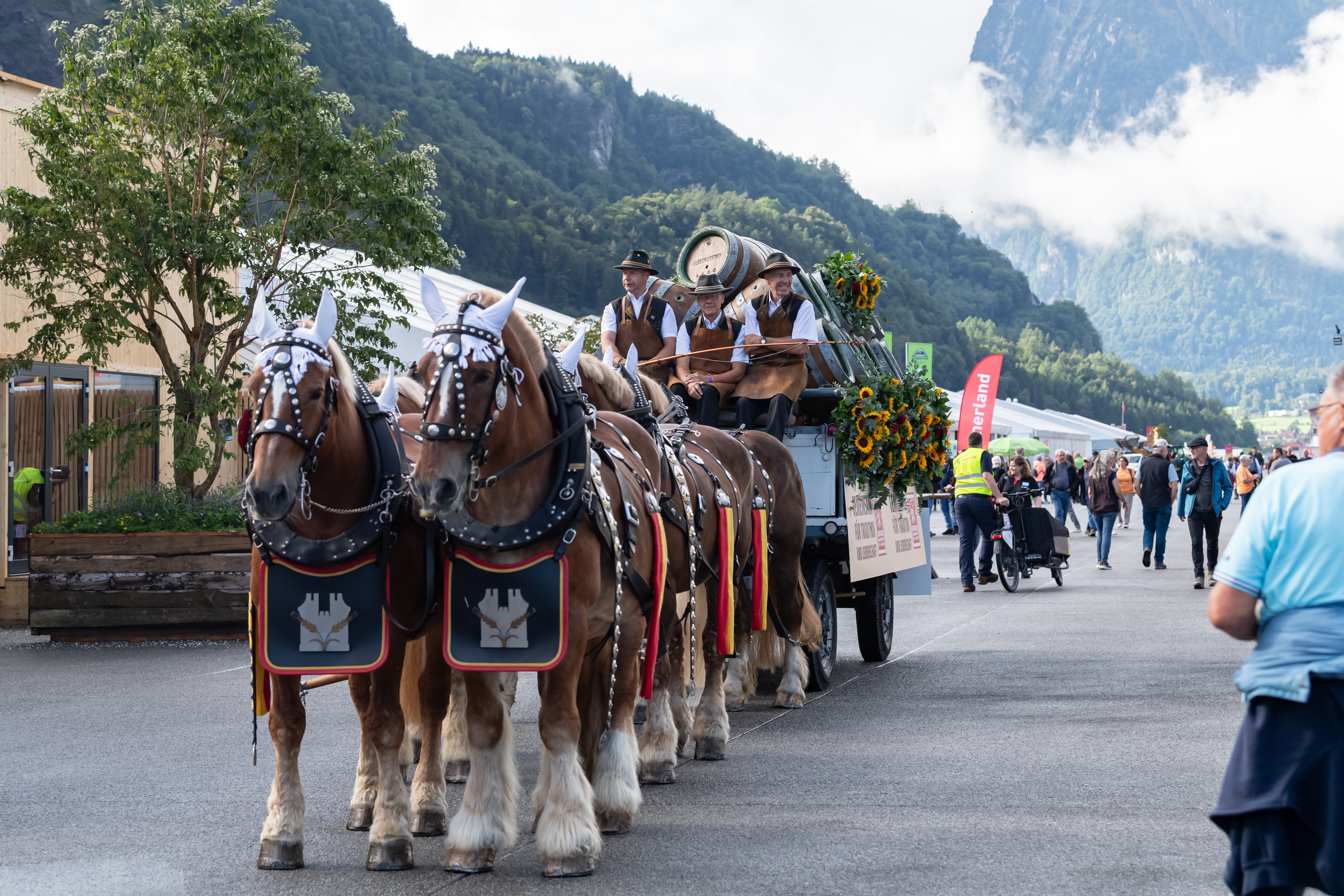 Der Sechsspänner von Feldschlösschen bringt das Fass zum Fassanstich für die Eröffnung des ESAF 2025 Glarnerland+.