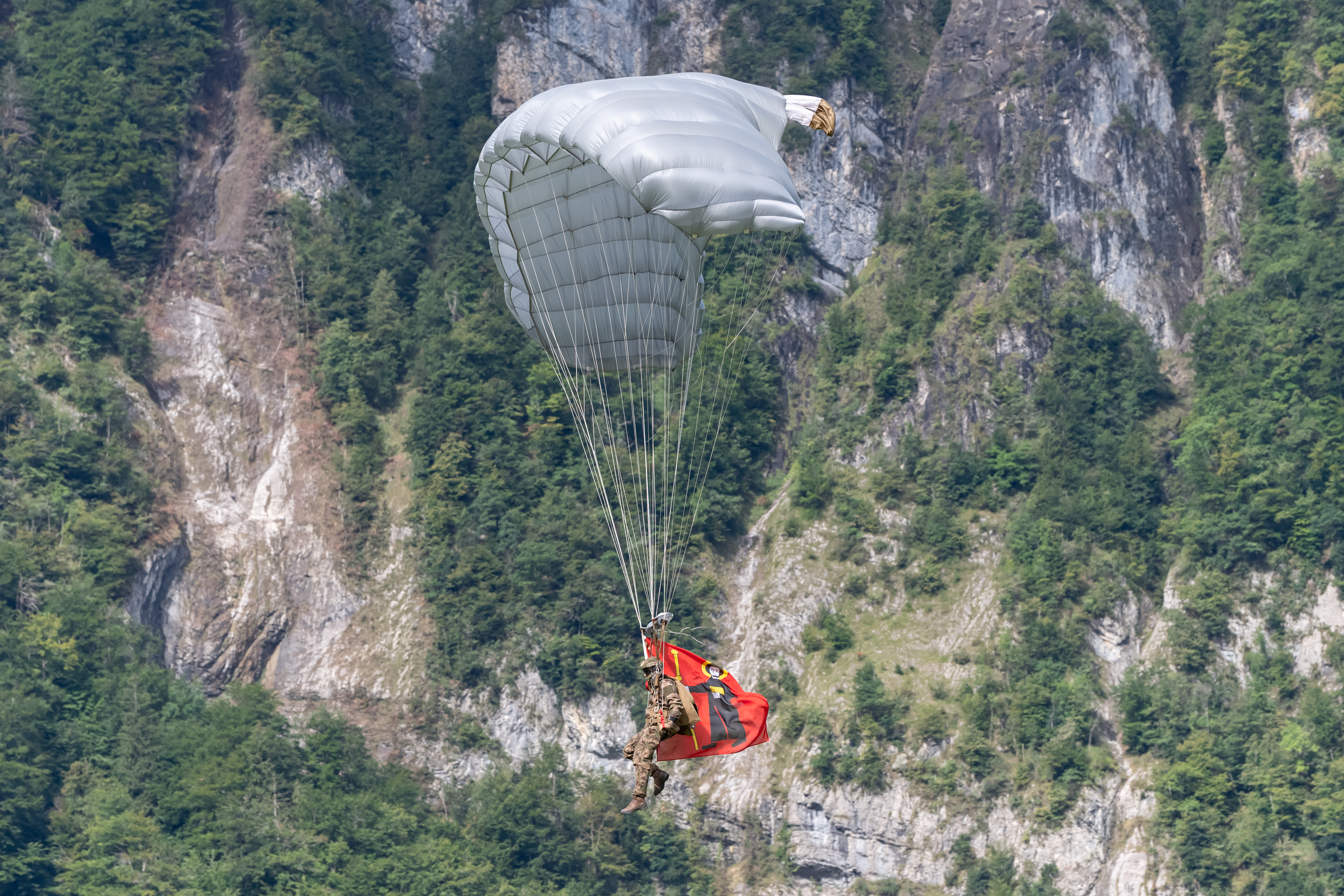 Das ESAF 2025 Glarnerland+ ist eröffnet. OK-Präsident Jakob Kamm sticht das Fass an und begrüsst offiziell zum Eidgenössischen Schwing- und Älplerfest 2025. Im Bild: Die Fallschirmaufklärer der Armee mit der Glarner und Schweizer Fahne.