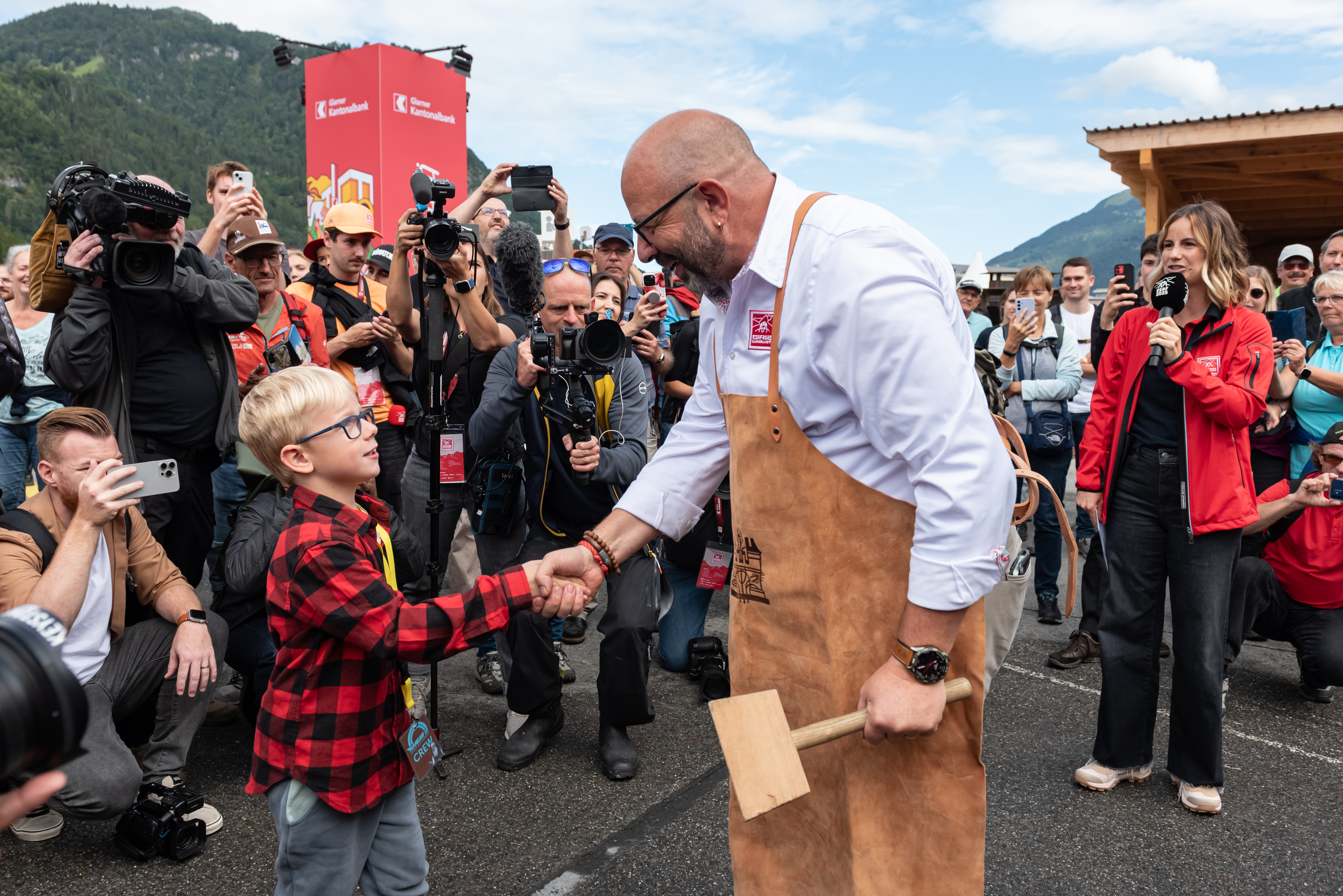 Das ESAF 2025 Glarnerland+ ist eröffnet. OK-Präsident Jakob Kamm sticht das Fass an und begrüsst offiziell zum Eidgenössischen Schwing- und Älplerfest 2025. Im Bild: Ein kleiner Junge übergibt dem OK-Präsidenten den Hammer zum Anstich.