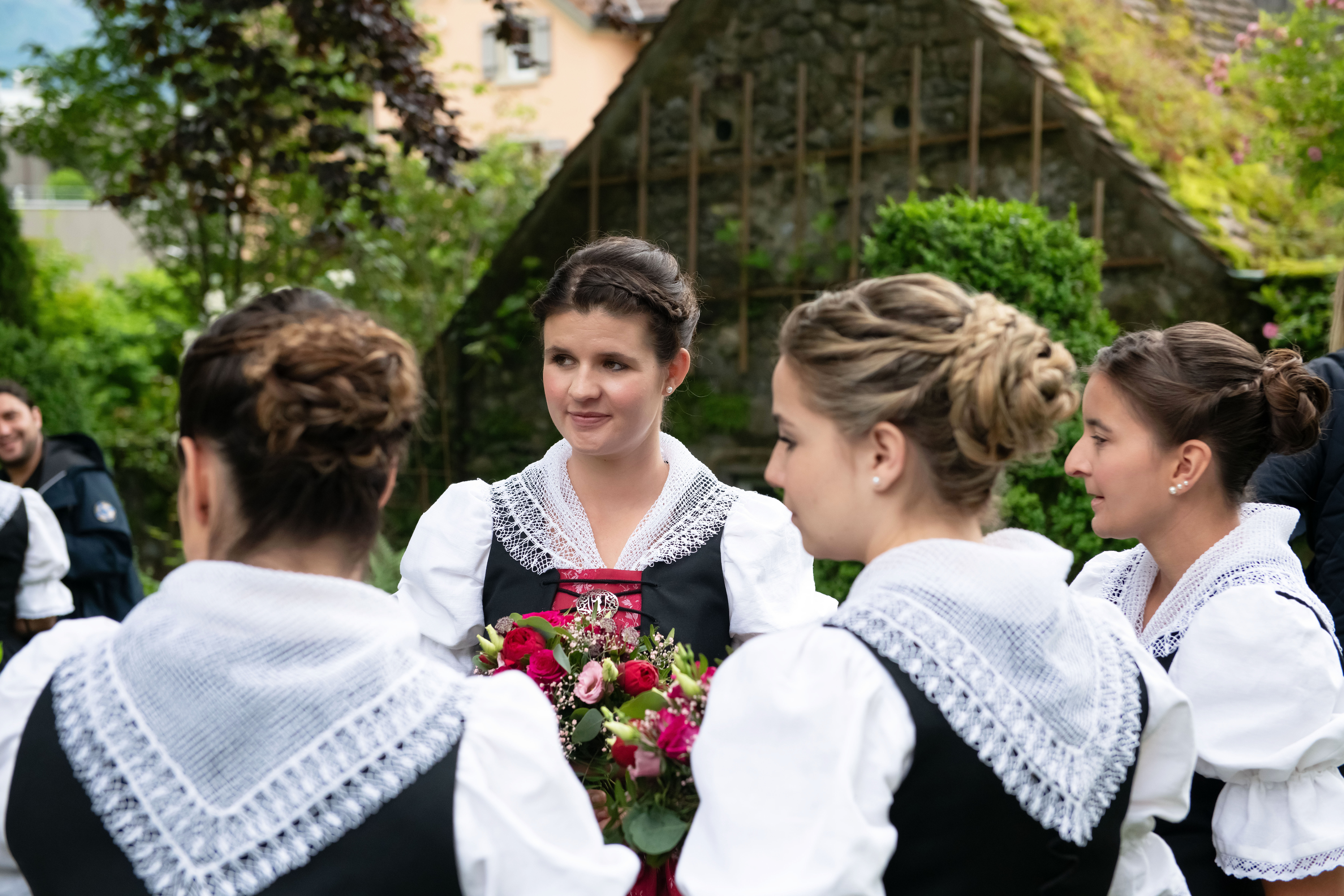 Im Bild: Ehrendame Isabella Figi blickt mit (v.l.) Svenja Müller, Sarah Leuzinger und Stefanie Beglinger dem nächsten Auftritt entgegen. Sie tragen die Neue Glarner Kirchentracht.