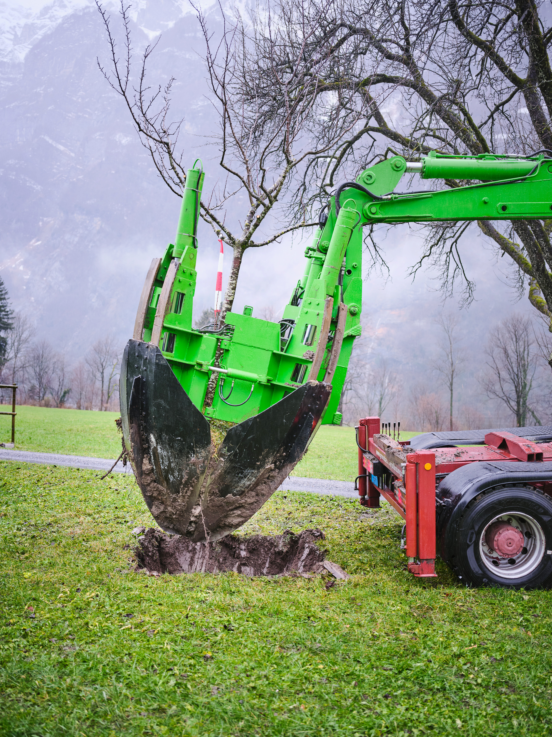 Am ESAF 2025 Glarnerland+ werden Bäume versetzt. Der Wurzelballen ist durch eine Spezialmaschine ausgestochen, der Baum wird aus der Erde gehoben.