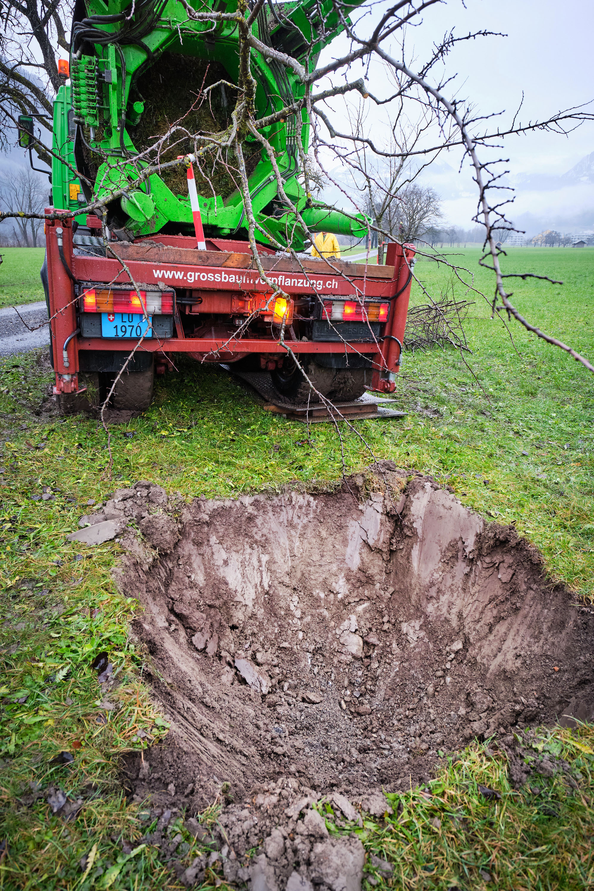 Am ESAF 2025 Glarnerland+ werden Bäume versetzt. Nach der Extraktion des Baumes mittels einer Spezialmaschine wird deutlich, wieviel Erdreich gemeinsam mit dem Baum transferiert wird.